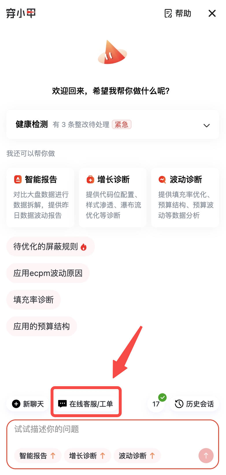 「穿小甲」智能小助手是穿山甲平台为媒体开发者打造的一站式智能服务工具,集 健康检测、智能报告、增长诊断、波动诊断、在线客服 五大核心能力于一体。