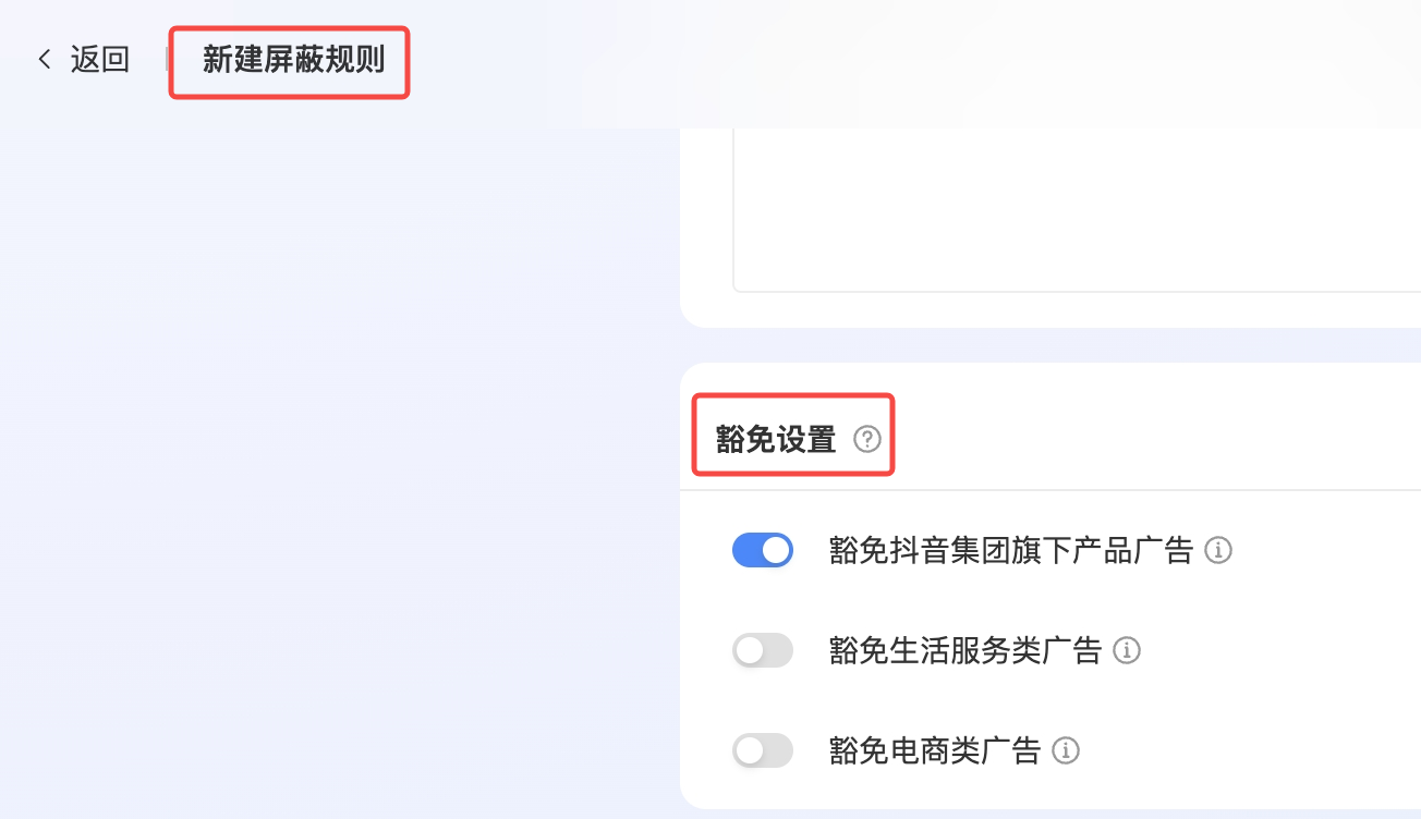部分屏蔽条件会命中头部广告主的优质广告,因此建议添加豁免该类广告,减少屏蔽对收入的影响。
