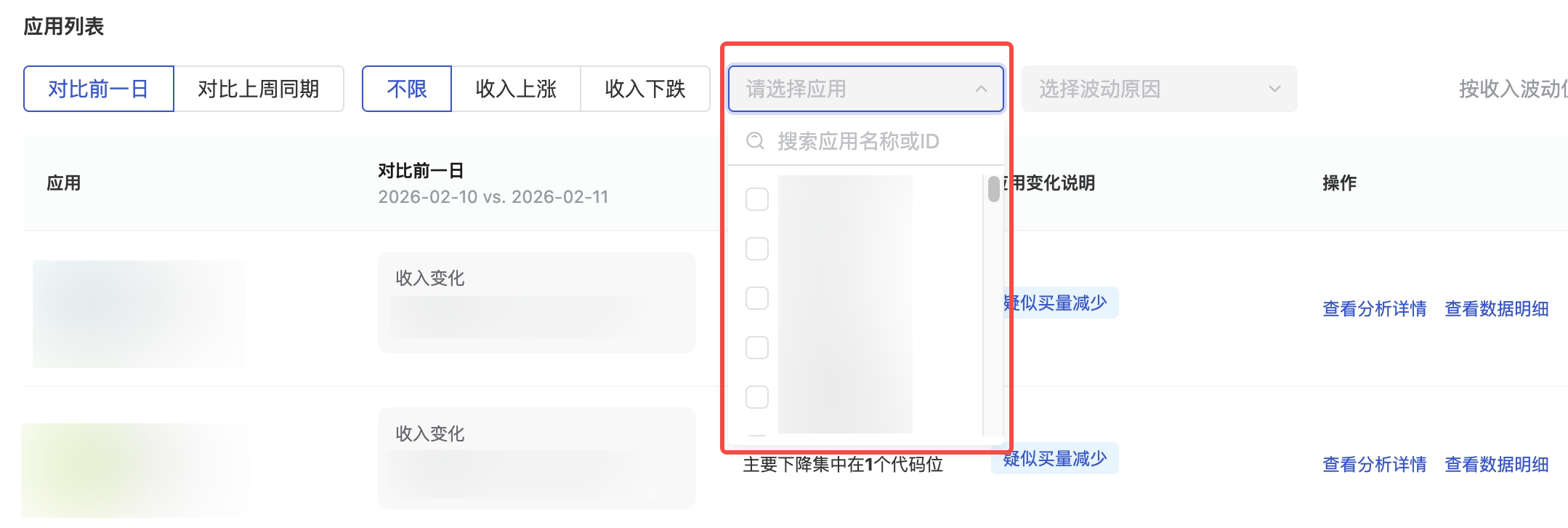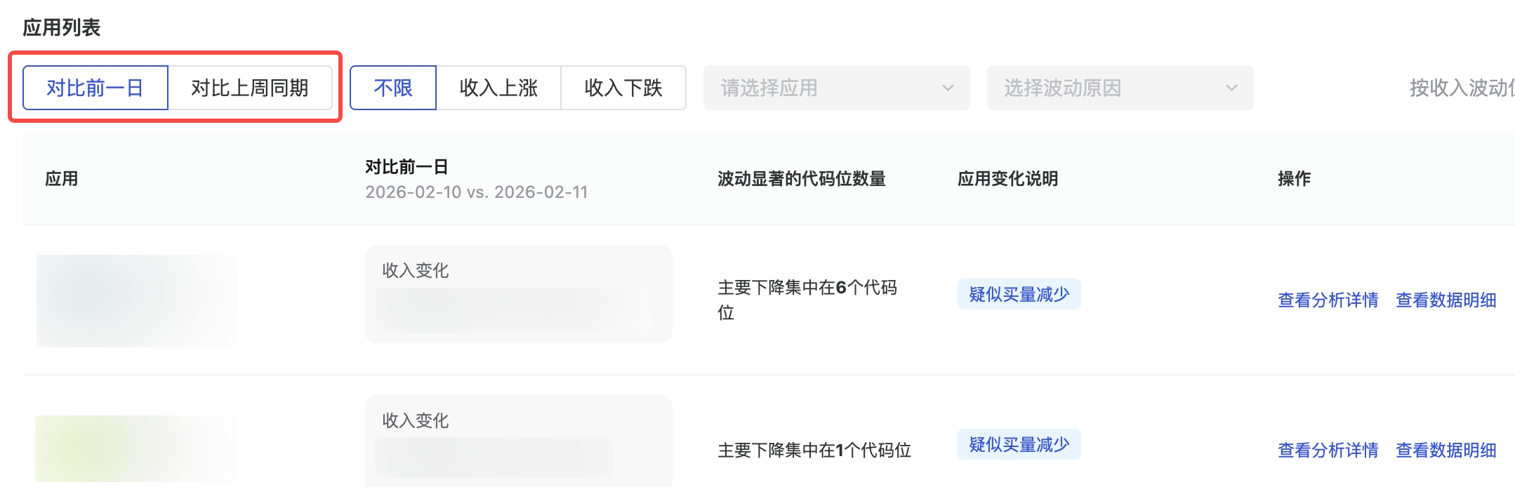 品牌/自售占量 | 应用流量明显下降,且具体代码位类型收益波动明显,推测是品牌或自售广告占量导致,建议排查确认 | |