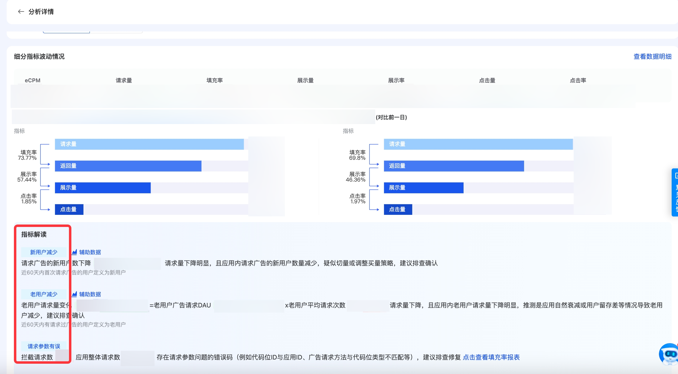 展示率 | 展示率下降 | 应用展示率下降超过3%,建议确认:1)切量逻辑是否有更改;2)bidding代码位竞胜率及竞品平台预算情况;3)是否新增预加载逻辑或请求与展示时机的变化;4)是否一次请求多条素材;5)媒体是否请求响应后新增过滤机制 |