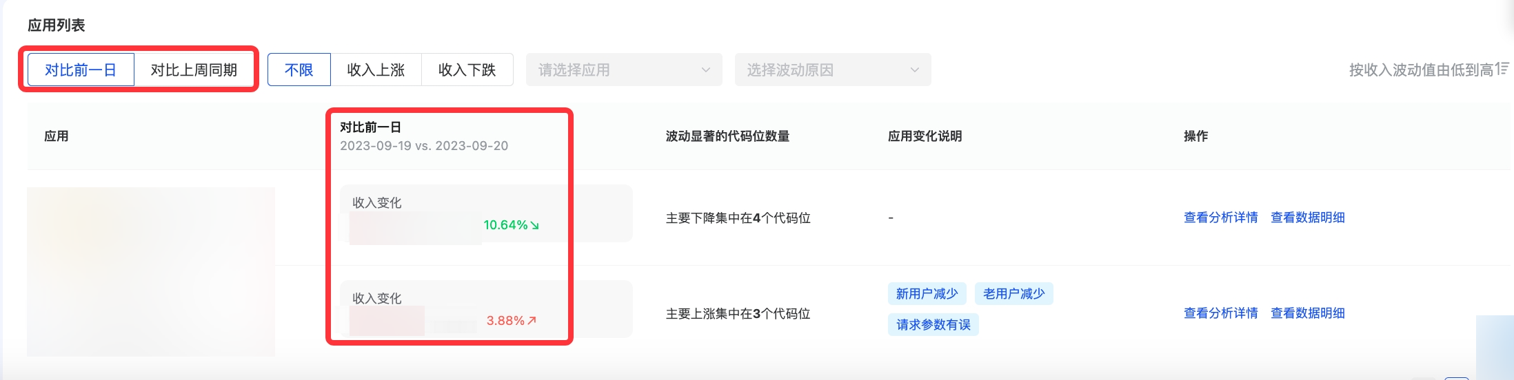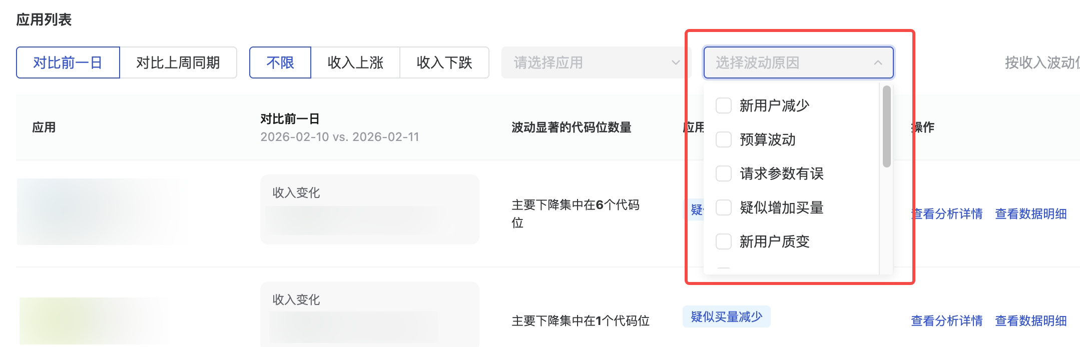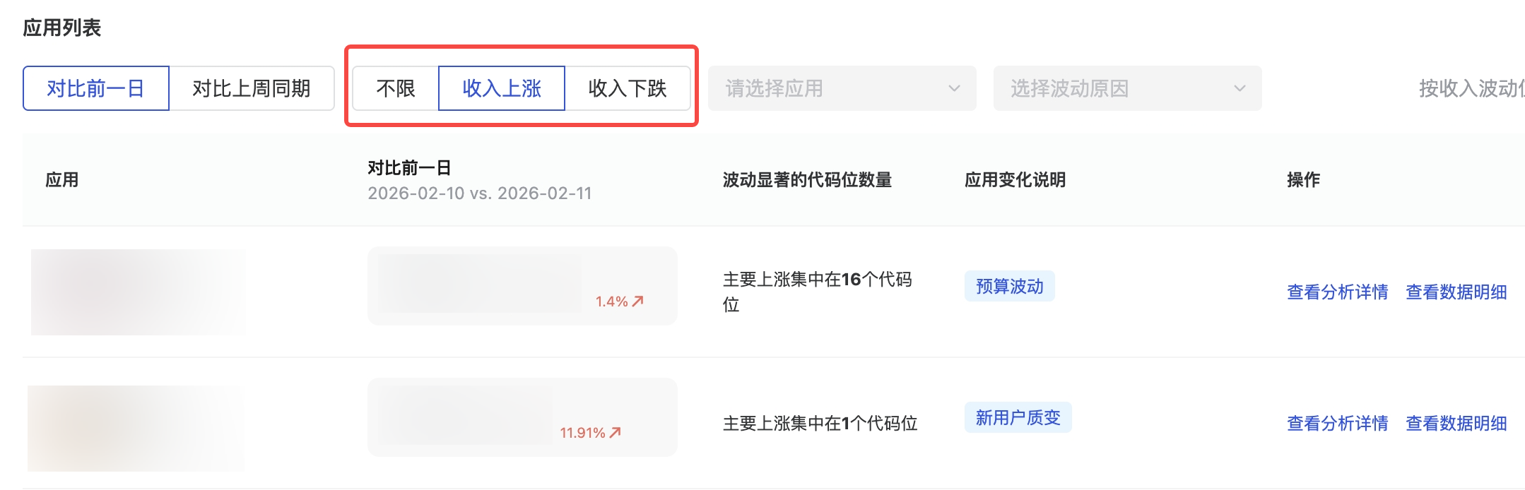 预算变化 | 预算波动 | 预算出现波动,导致应用收益有所变化;预算波动和大盘趋势一致,非个例情况,建议可持续观察数据再决定是否调整变现策略 |