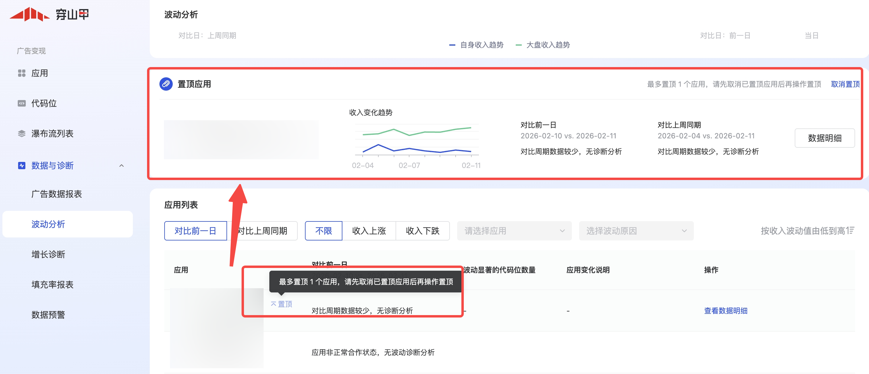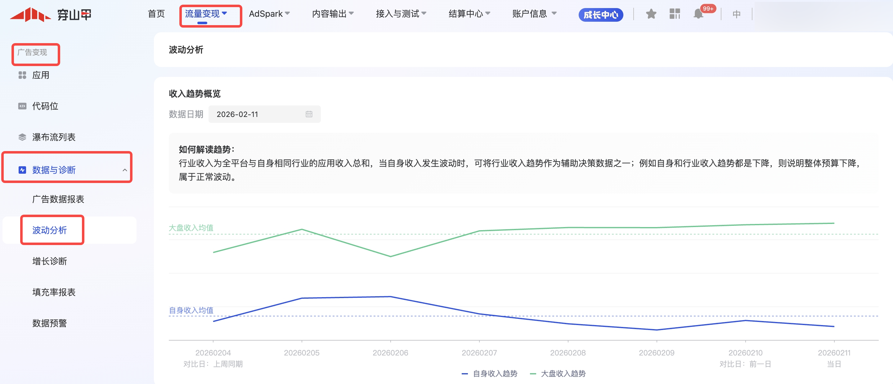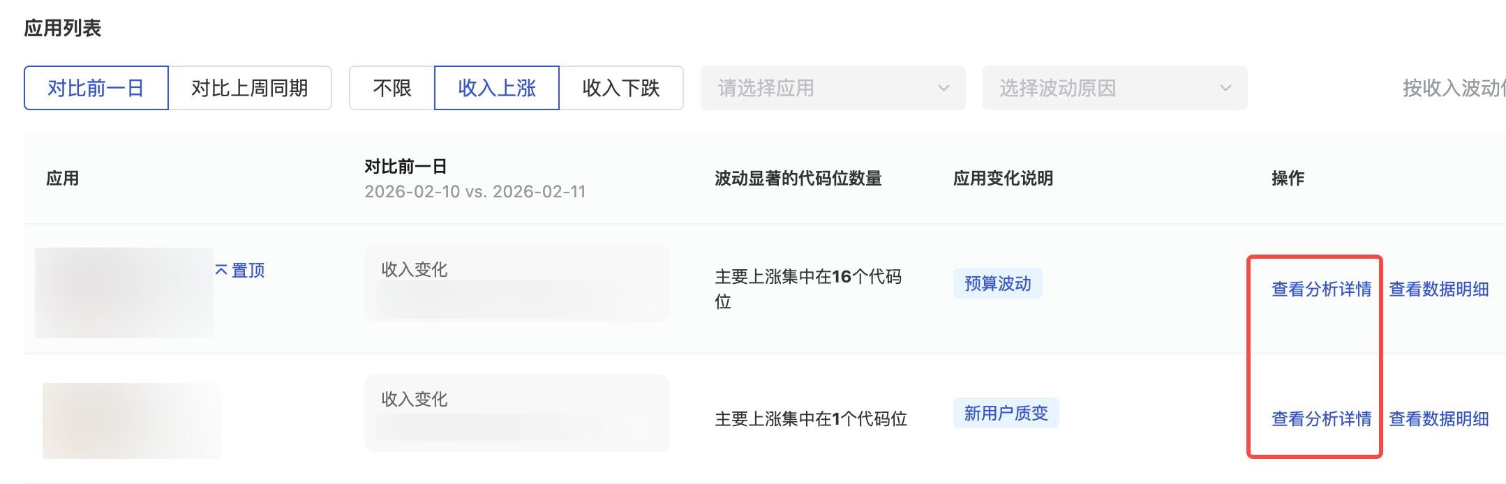 预算变化 | 预算波动 | 预算出现波动,导致应用收益有所变化;预算波动和大盘趋势一致,非个例情况,建议可持续观察数据再决定是否调整变现策略 |