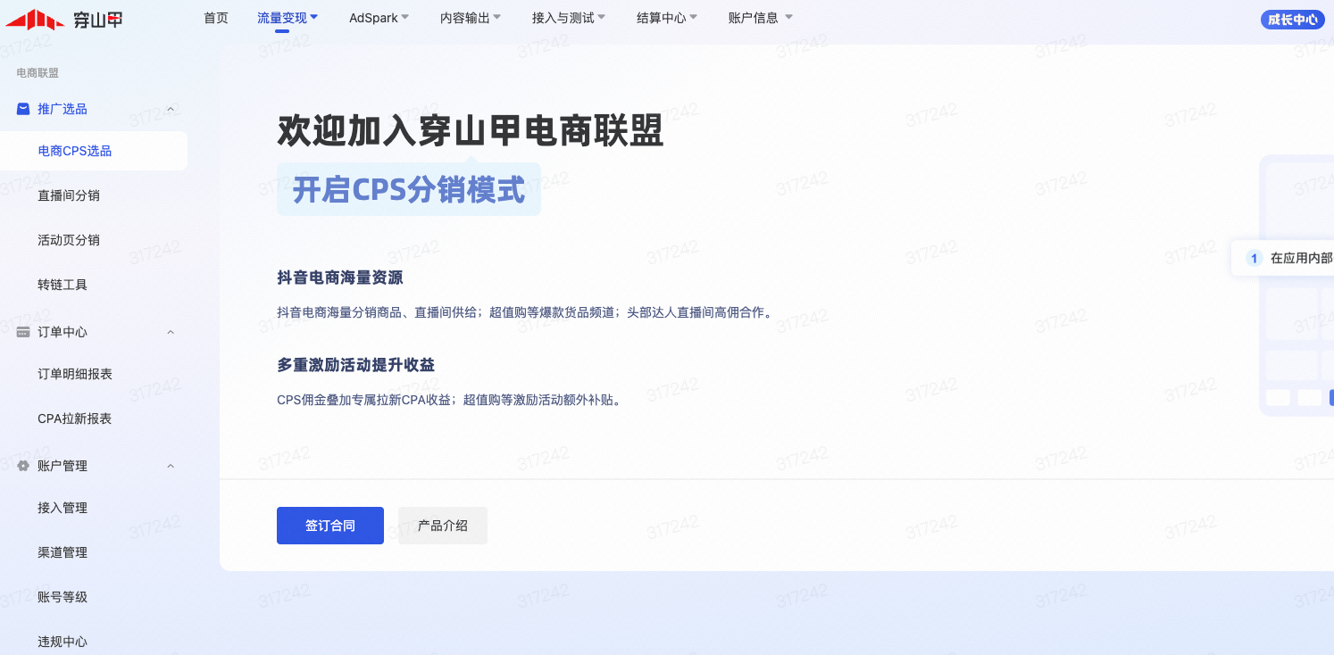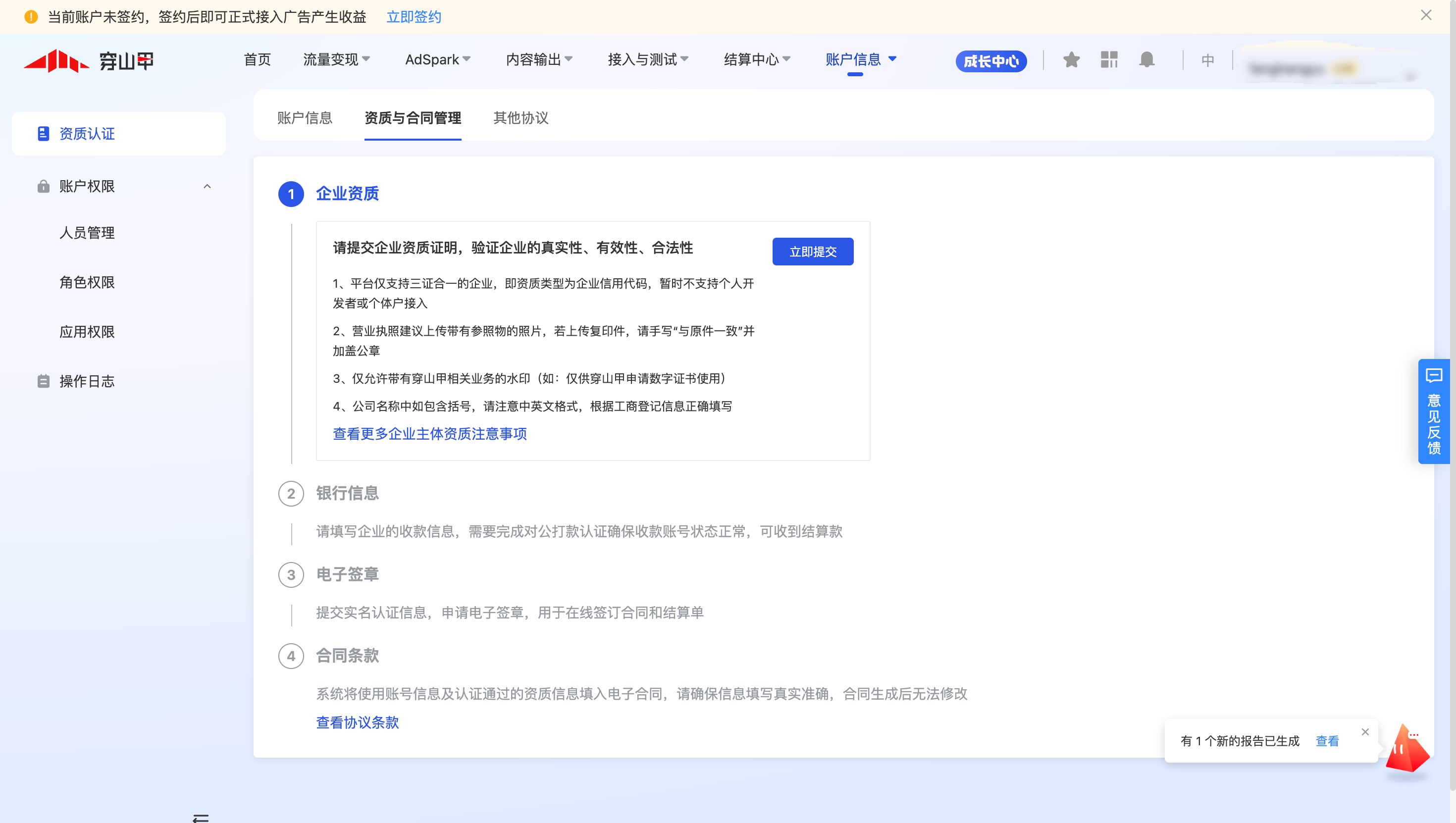 (需注意:个体工商户【资质与合同管理】页面与其他媒体不同,若不为下图页面,请注销该账号后重新注册)