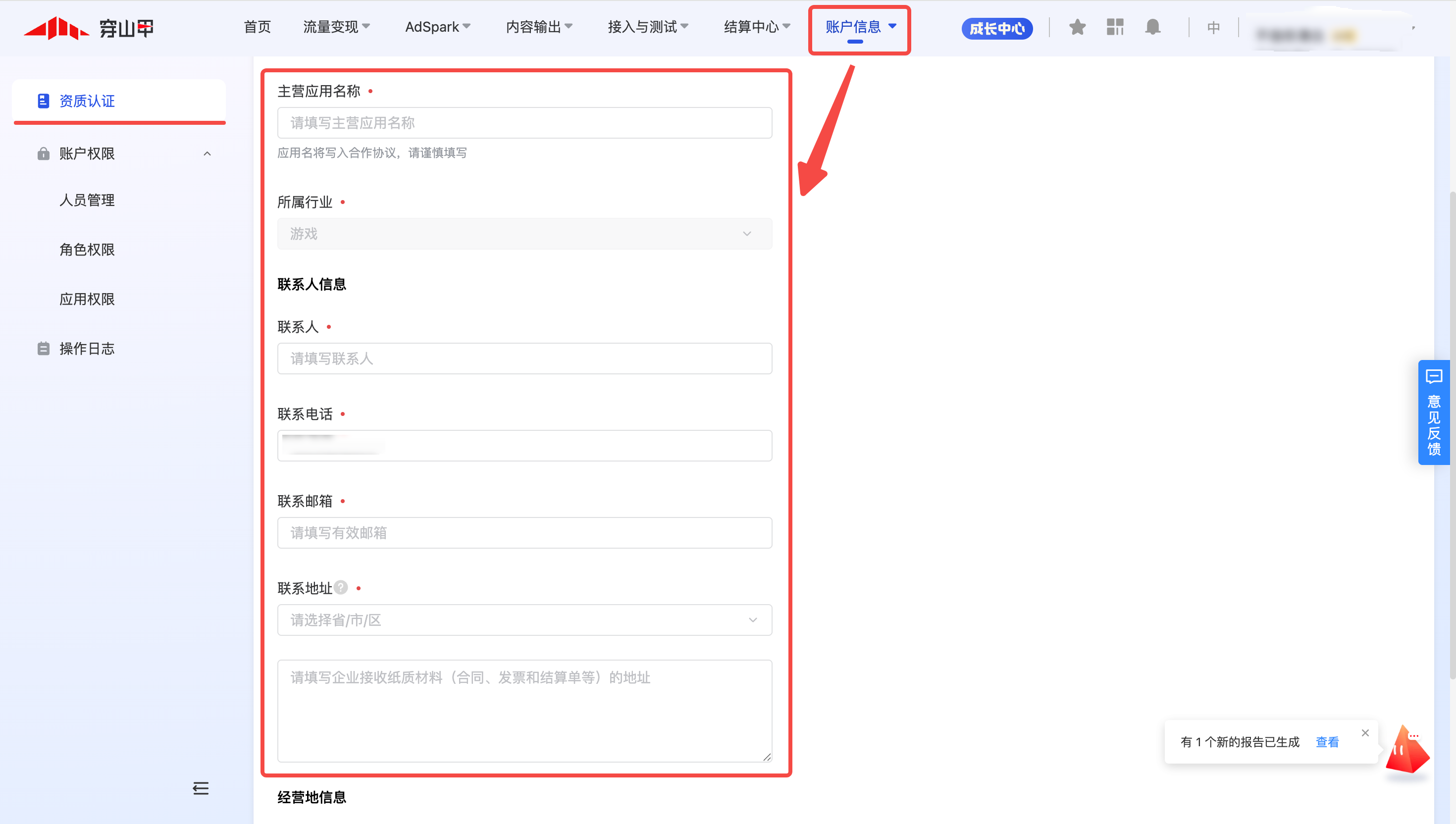 进入平台后,请到【账户信息】-【资质认证】页面完成基础信息及联系人信息填写;