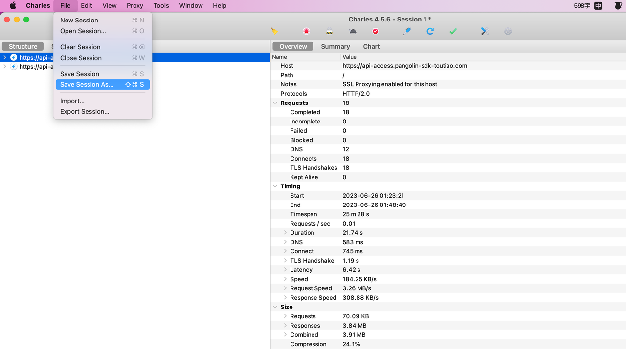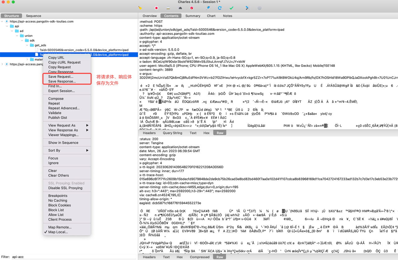 提供抓包内容:charles抓包内容可分为保存Session或保存Request、Response两种方式提供给穿山甲开发者人员进行问题的定位