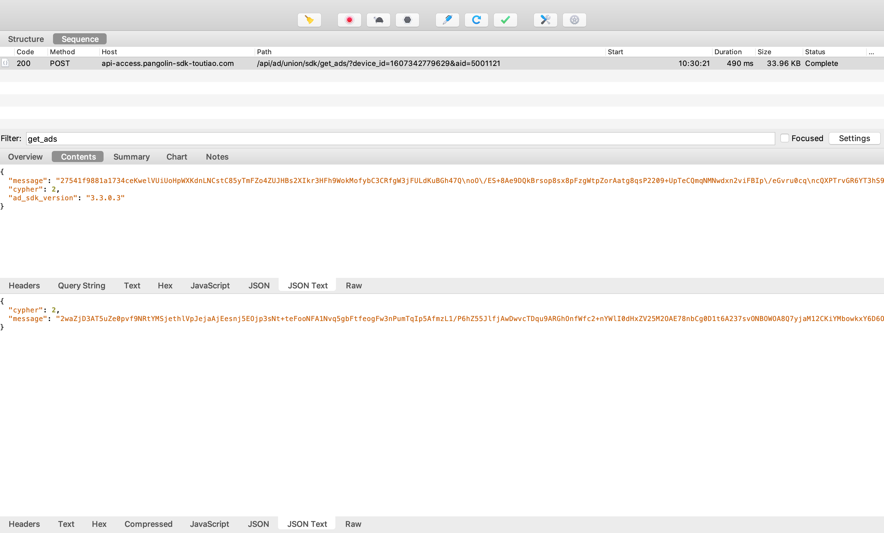 开发者在请求广告时,可以通过抓包工具抓到穿山甲广告的相关请求数据。开发者提供对应的广告请求和返回信息给到穿山甲开发者人员进行问题的定位